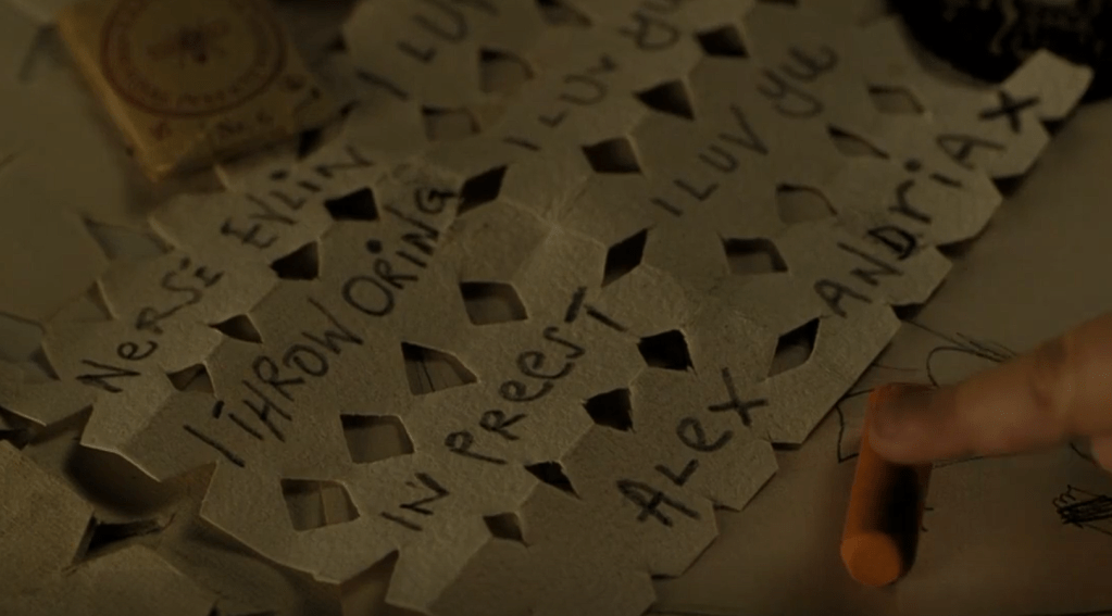 Alexendria, korktuğu zamanlarda söylemek için yaşlı adamdan bir tekerleme öğrenmiştir. “Gugli Gugli Kaybol” (bu arada film 7. karedeki gibi başlıyor)