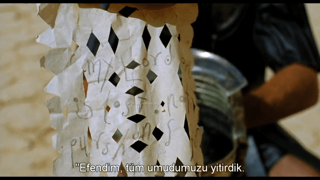 Film, küçük kızın zihnine girmemizi sağlayarak ne hayal ettiğini görmemize müsaade ediyor. Roy efsanede siyahi bir karakterden söz ettiğinde Alexendria doğrudan hastaneye buz taşıyan işçiyi (muhtemelen köle) hayal ediyor. Yahut kendi gizli mesajı ile hikâyedeki Büyük İskender’e gelen gizli mesaj aynı biçimde. 2. karede Alexendria’nın Hemşire Evelyn’e yazdığı gizli mesaj 3. karede ise hikâyede Büyük İskender’e gelen gizli mesaj var.